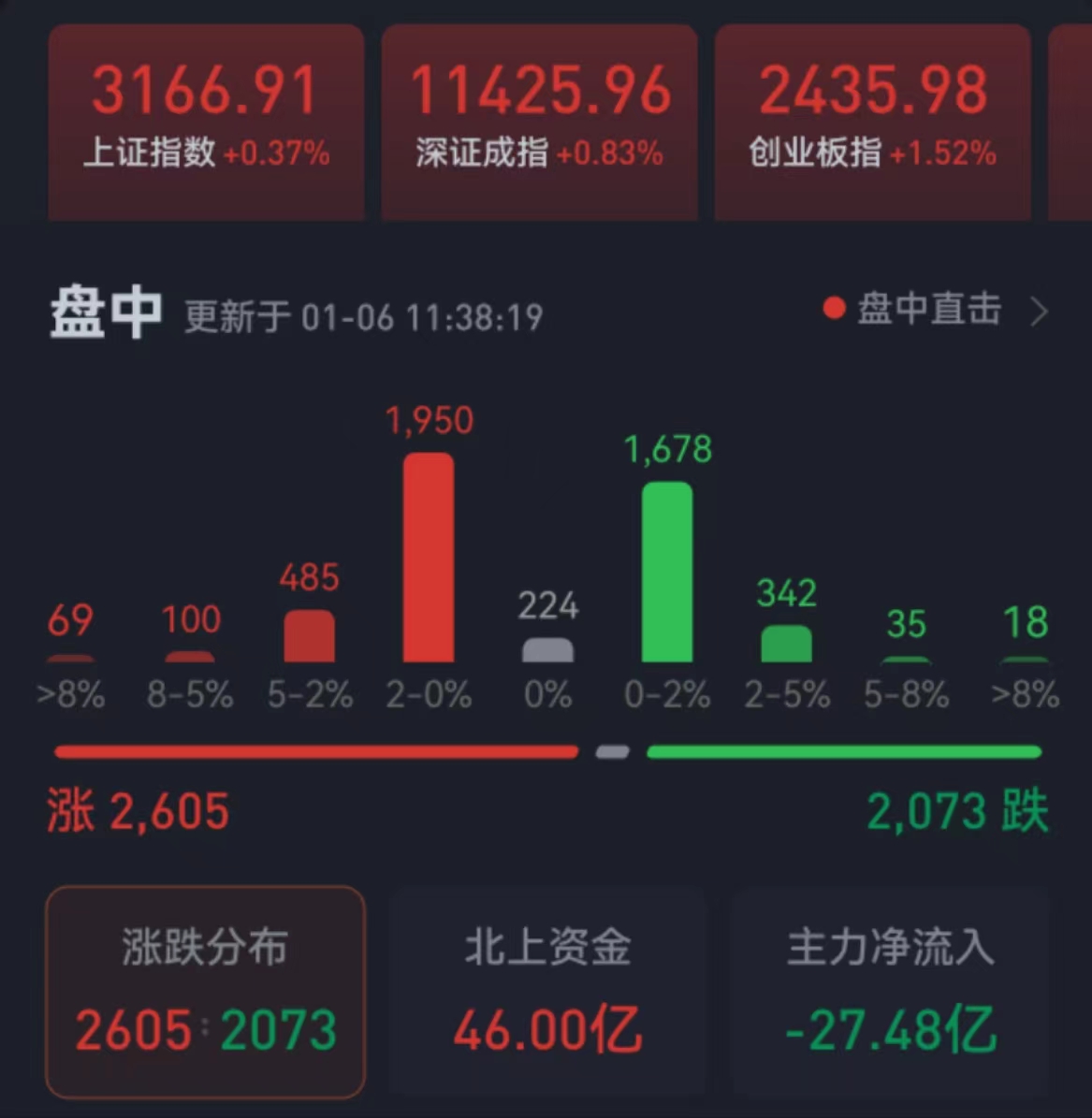 周五(1月6日),三大股指繼續(xù)震蕩走強(qiáng),全線飄紅。截至上午收盤(pán),上證指數(shù)漲幅達(dá)0.37%,報(bào)3166.91點(diǎn);深證成指和創(chuàng)業(yè)板指漲幅分別為0.83%和1.52%;滬深兩市合計(jì)成交額5220.8億元,總體來(lái)看,兩市個(gè)股漲多跌少,上漲個(gè)股近超2600只,其中,漲停個(gè)股達(dá)40只,跌停個(gè)股達(dá)8只。