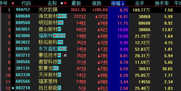 具體看,截至1月6日上午收盤(pán),光伏膠膜板塊表現(xiàn)搶眼,漲幅達(dá)8.75%。其中,海優(yōu)新材漲16.91%。東方盛虹、聯(lián)泓新科、鹿山新材、東方盛虹等概念股紛紛漲停。