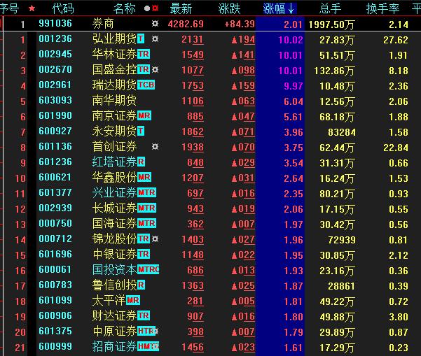 具體看,截至1月19日上午收盤,券商板塊表現搶眼,漲幅達2.01%。其中,弘業期貨、華林證券子、國盛金控、瑞達期貨等概念股均沖至漲停。