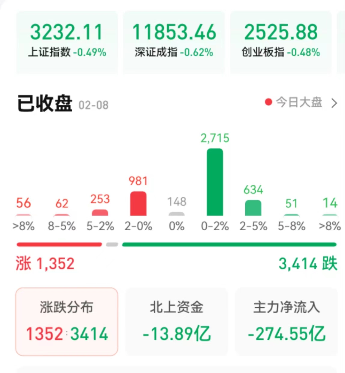 周三(2月8日),A股三大股指震蕩走低。截至收盤,上證指數跌0.49%報3232.11點,深證成指跌0.62%報11853.46點,創業板指跌0.48%報2525.88點;兩市合計成交8047億元,北向資金凈賣出13.89億元,連續4個交易日流出,累計凈賣出金額達100.39億元。總體上看,兩市個股跌多漲少。其中,漲停個股達35只,跌停個股6只。