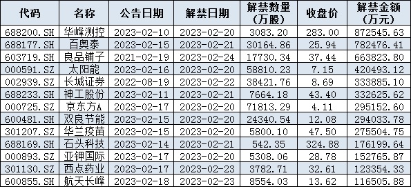 與此同時,統計顯示,下周(2月20日-24日)共有56家公司限售股陸續解禁,按最新收盤價計算,解禁市值為559.14億元。從解禁市值來看,華峰測控(87.25億元)、百奧泰(78.25億元)、良品鋪子(66.38億元)等公司解禁金額均超60億元,位居前三位。解禁股數居前三位的是京東方A(7.18億股)、太陽能(5.88億股)、長城證券(3.84億股)。