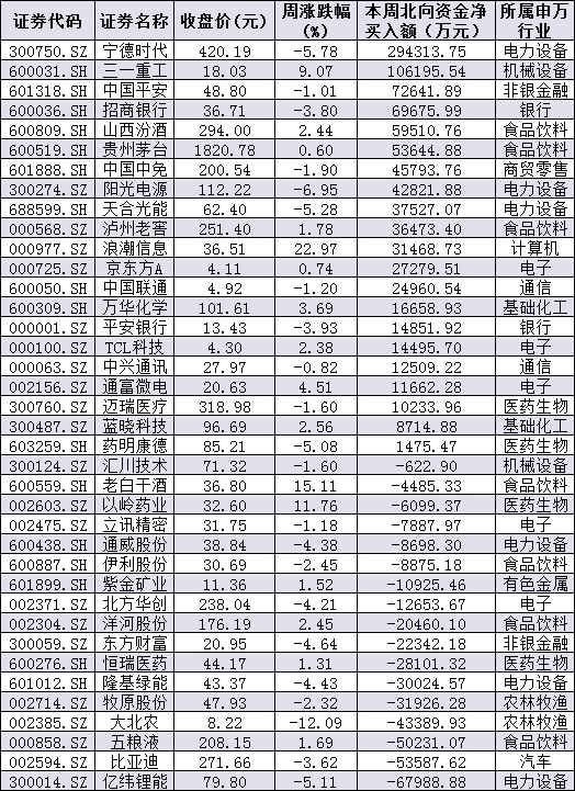 資金方面,周五,北向資金凈買入金額達20.29億元,其中,滬股通凈買入6.26億元,深股通凈買入14.03億元。本周北向資金累計凈買入金額達82.51億元。從前十大成交活躍股來看,本周,寧德時代、三一重工等2只個股,北向資金凈買入金額均超10億元。另外,億緯鋰能、比亞迪、五糧液等個股遭北向資金凈賣出金額均超5億元。