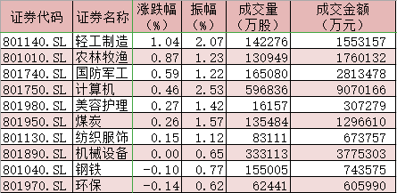 板塊方面,從申萬一級行業(yè)看,今日僅8個行業(yè)上漲,輕工制造和農(nóng)林牧漁漲幅居前,其中僅輕工制造行業(yè)指數(shù)漲幅超1%。