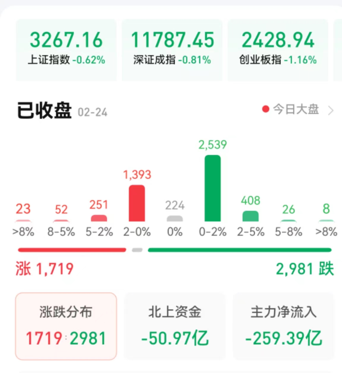 周五(2月24日),A股三大指數震蕩下探。截至收盤,上證指數跌0.62%報3267.16點,深證成指跌0.82%報11787.45點,創業板指跌1.16%報2428.94點;兩市合計成交7258億元,北向資金凈賣出50.97億元??傮w上看,兩市個股跌多漲少。其中,漲停個股達17只,跌停個股達6只。