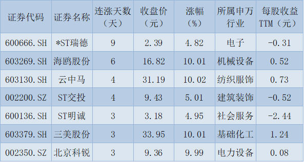 漲停股方面,今日有21只個股以漲停價報收,其中,有7只個股,股價已連續上漲超過3個交易日;跌停方面,有7只個股跌停價報收。從申萬一級行業看,電力設備行業漲停股數量居首,為4只,機械設備和紡織服飾緊隨其后,漲停股數均為3只。