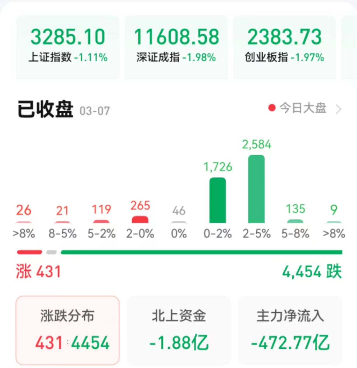 周二(3月7日),A股三大指數(shù)震蕩回落,跌幅均超1%。截至收盤,上證指數(shù)跌1.11%,報3285.1點;深證成指跌1.98%,報11608.58點;創(chuàng)業(yè)板指跌1.97%,報2383.73點。兩市合計成交金額達9327億元;北向資金凈賣出1.88億元。總體上看,兩市個股跌多漲少,超4400只個股出現(xiàn)下跌。