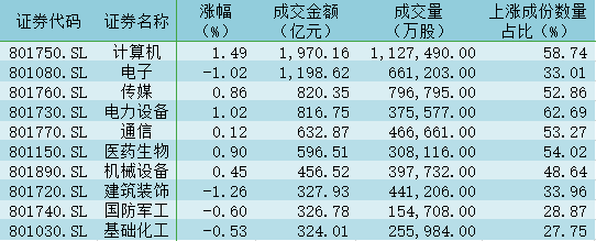 計(jì)算機(jī)、電力設(shè)備均漲超1%
