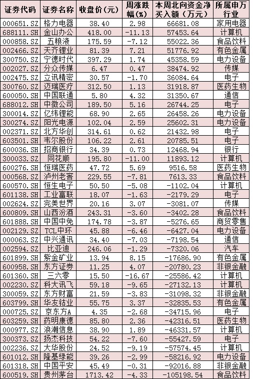 資金方面,本周北向資金累計凈買入金額達47.56億元。從前十大成交活躍股來看,本周,格力電器、金山辦公、五糧液、天齊鋰業等4只個股,北向資金凈買入金額均超5億元。另外,貴州茅臺、中國平安等個股遭北向資金凈賣出金額均超9億元。
