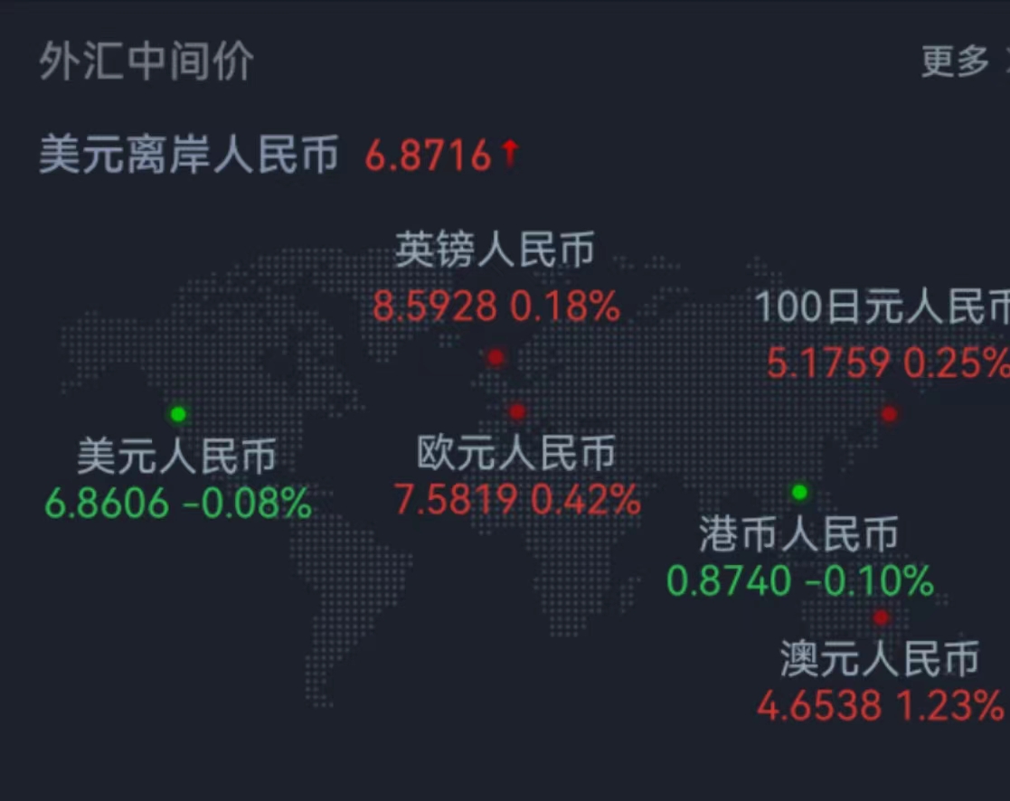 周五在岸人民幣兌美元16:30收盤報6.8495,較上一交易日漲226個基點,周漲259個基點。人民幣兌美元中間價報6.8606,調升52個基點,本周累計調升232個基點。在岸人民幣兌美元夜盤收報6.8690。
