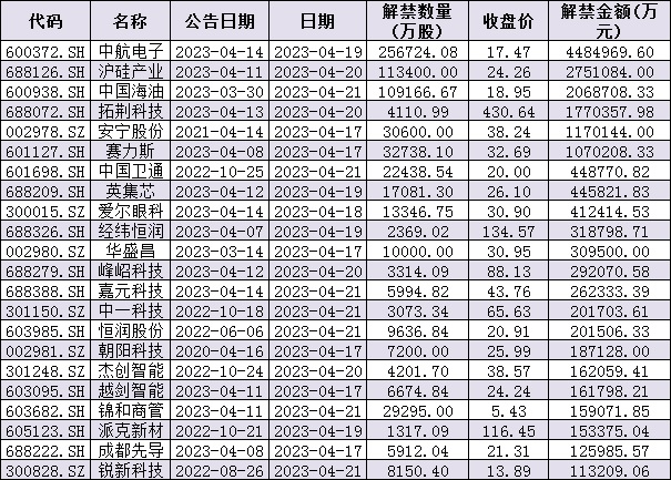 與此同時,統計顯示,下周(4月17日—21日)共有54家公司限售股陸續解禁,按最新收盤價計算,解禁市值為1779.43億元。從解禁市值來看,中航電子(448.5億元)、滬硅產業(275.11億元)、中國海油(206.87億元)、拓荊科技-U(177.01億元)、安寧股份(117.01億元)、賽力斯(107.02億元)等公司解禁金額均超100億元。