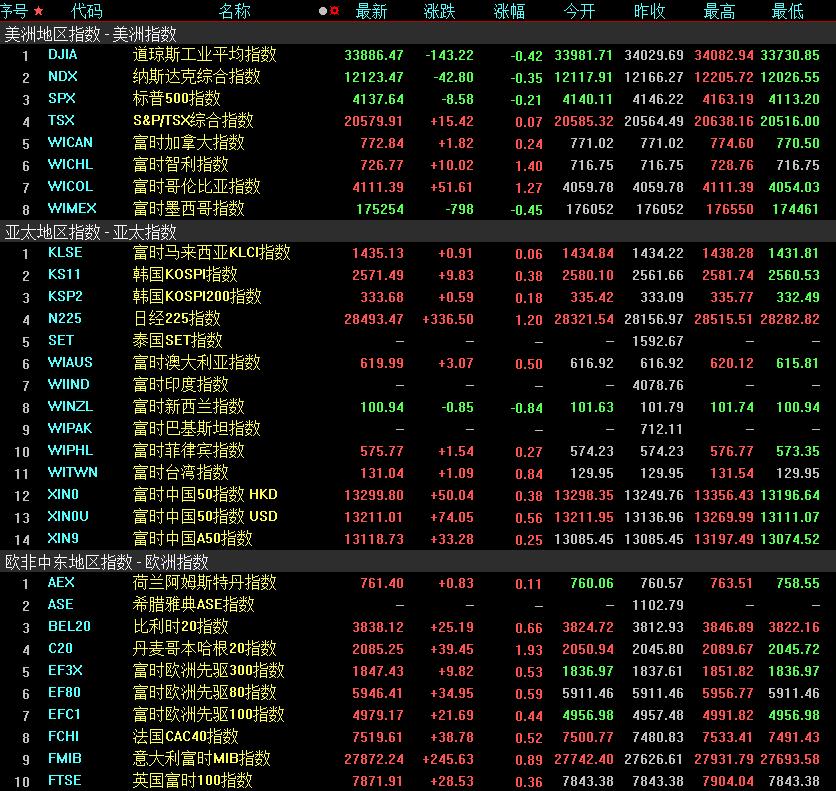 周五,美國三大股指全線收跌,道指跌0.42%報33886.47點,標普500指數跌0.21%報4137.64點,納指跌0.35%報12123.47點。本周,道指漲1.2%,標普500指數漲0.79%,納指漲0.29%。