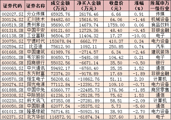 表:今日滬、深股通前十大成交活躍股交易情況: