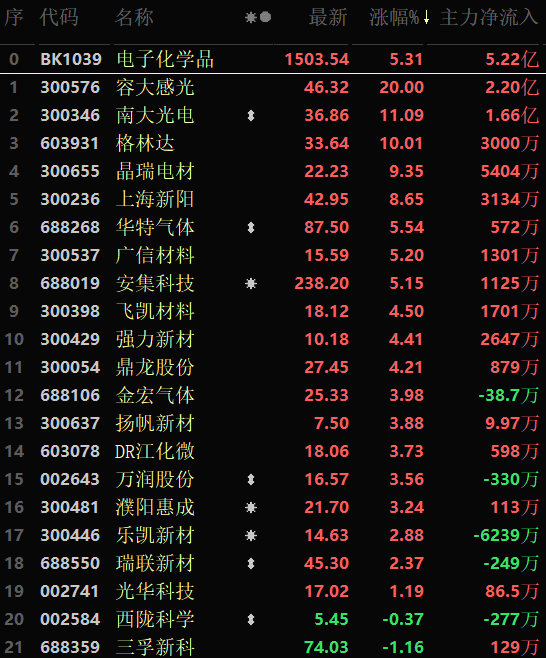 從早盤表現(xiàn)強(qiáng)勢的電子化學(xué)品行業(yè)看,交易中的21只成分股有19只上漲,其中,有8只個股漲幅超5%。資金方面,有5.22億元大單資金凈流入該行業(yè),居各行業(yè)第3位。