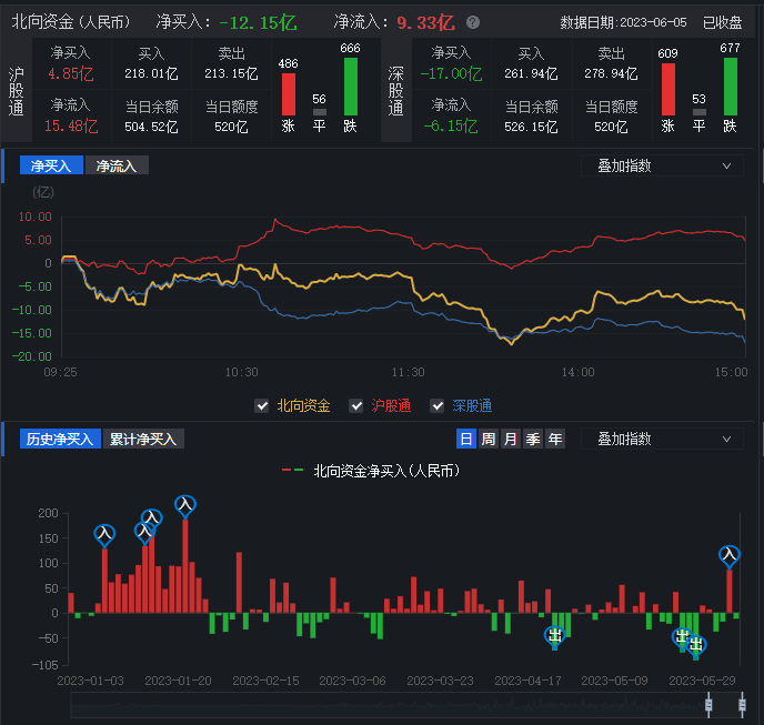 6月5日,滬指小幅高開,午后圍繞平盤線窄幅整理,深證成指、創業板指低開低走,今日兩市呈滬強深弱格局。北向資金全天凈賣出12.15億元,其中滬股通凈買入4.85億元,深股通凈賣入17億元。今日A股上漲數稍多于下跌數,有2608只上漲,2159只下跌。