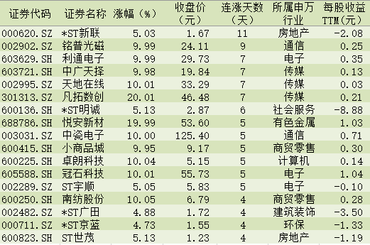 漲停股方面,今日有72只個股以漲停價報收,其中,有17只個股,股價已連續上漲超過4個交易日;跌停方面,有11只個股跌停價報收。從申萬一級行業看,傳媒行業漲停股數量居首,為10只,電子和通信緊隨其后,漲停股數分別為9只和7只。上周五已連收10個漲停板的*ST新聯,今日再度一字漲停。