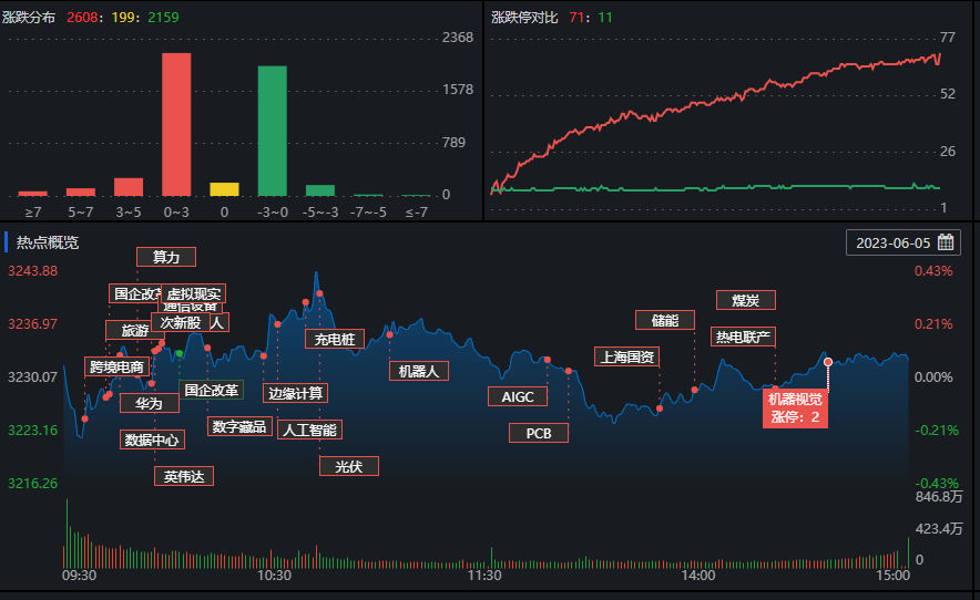 6月5日,三大指數走勢分化。截至收盤,滬指漲0.07%,報3232.44點,深證成指跌0.47%,報10946.08點,創業板指跌1.39%,報2202.14點,A股合計成交額8749.35億元,較前一交易日縮減7.13%;板塊方面,傳媒板塊內10只個股漲停。多位業內分析人士表示,市場進一步下跌的空間相對有限,中期機會大于風險。