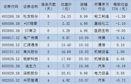 漲停股方面,今日有55只個股以漲停價報收,其中,有10只個股,股價已連續上漲超過4個交易日;跌停方面,有5只個股跌停價報收。從申萬一級行業看,汽車漲停股數量居首,為8只,機械設備和電力設備緊隨其后,漲停股數均為7只。