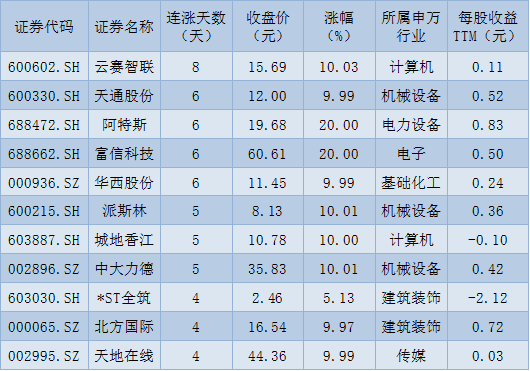 漲停股方面,今日有65只個股以漲停價報收,其中,有11只個股,股價已連續上漲超過4個交易日;跌停方面,有3只個股跌停價報收。從申萬一級行業看,計算機和機械設備行業漲停股數量并列居首,均為10只,緊隨其后的是建筑裝飾行業,漲停股數為7只。