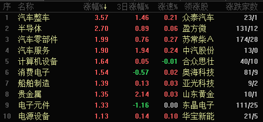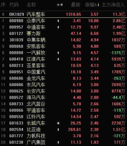 從早盤(pán)表現(xiàn)強(qiáng)勢(shì)的汽車整車行業(yè)看,交易中的24只成份股中,有23只上漲,其中,有3只個(gè)股漲幅超5%。資金方面,有11.3億元大單資金凈流入該行業(yè),居第2位。