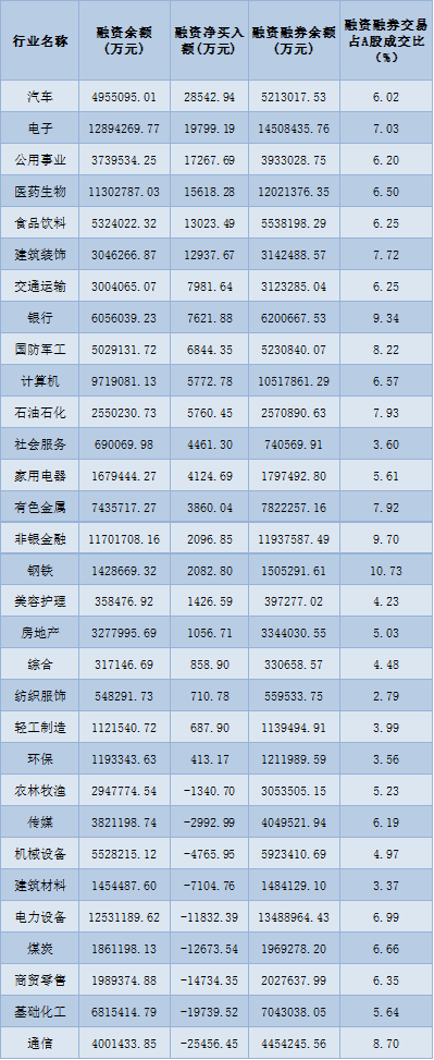 表:7月10日申萬(wàn)一級(jí)行業(yè)兩融交易情況