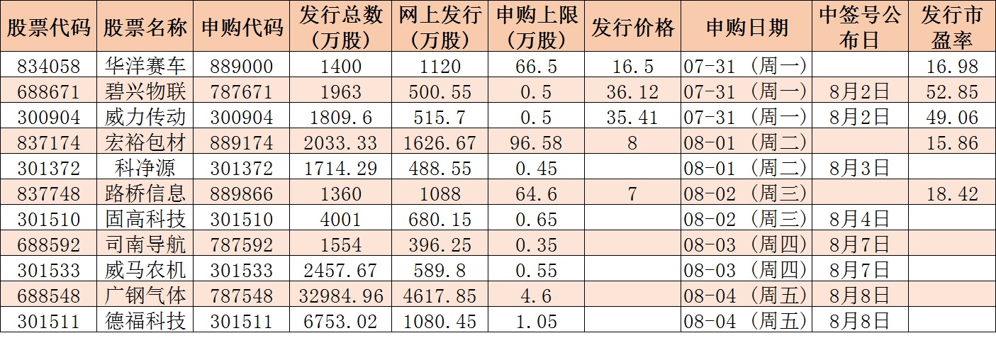 根據(jù)發(fā)行安排,下周有11只新股發(fā)行,7月31日發(fā)行的是威力傳動、碧興物聯(lián)、華洋賽車;8月1日發(fā)行的是科凈源、宏裕包材;8月2日發(fā)行的是固高科技、路橋信息;8月3日發(fā)行的是司南導航、威馬農(nóng)機;8月4日發(fā)行的是廣鋼氣體、德福科技。
