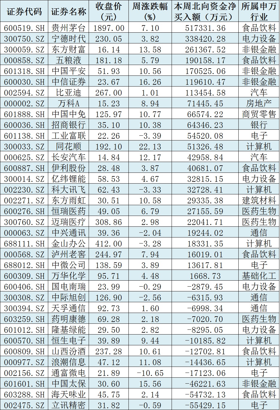 資金方面,本周北向資金累計凈買入金額達345.06億元,為今年2月以來最高值,其中,滬股通凈流入201.64億元,深股通凈流入143.42億元。從前十大成交活躍股來看,本周,貴州茅臺、寧德時代、東方財富、五糧液、中國平安、中信證券、比亞迪等7只個股,北向資金凈買入金額均超10億元。另外,立訊精密、海天味業(yè)等個股遭北向資金凈賣出金額均超5億元。