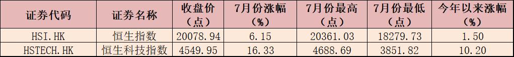 回顧7月份港股兩大指數的表現,同花順數據顯示,7月份,恒生指數期間累計上漲6.15%,報20078.94點;恒生科技指數期間累計上漲16.33%,報4549.95點;從月線來看,上述兩大指數均實現月線兩連漲,此外,恒生科技指數創今年以來最大單月漲幅。隨著港股走強,南向資金也積極進場搶籌,期間凈買入額為144.53億元。