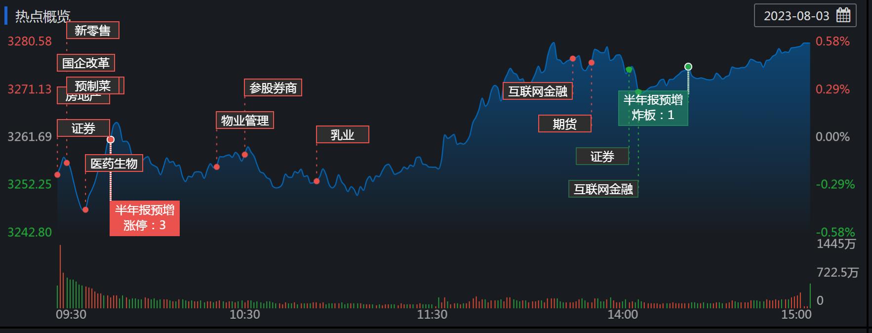 周四(8月3日),A股三大股指震蕩上行,全線飄紅。截至收盤,上證指數(shù)漲0.58%報(bào)3280.46點(diǎn),深證成指漲0.53%報(bào)11163.42點(diǎn),創(chuàng)業(yè)板指漲1.06%報(bào)2241.98點(diǎn);兩市合計(jì)成交8328.76億元,北向資金凈買入5.43億元。總體上看,兩市個(gè)股跌多漲少。其中,漲停個(gè)股達(dá)27只,跌停個(gè)股達(dá)6只。