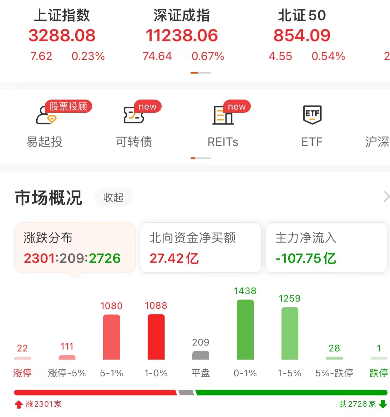 周五(8月4日),A股三大指數(shù)集體收漲,截至收盤,上證指數(shù)漲0.23%,深證成指漲0.67%,創(chuàng)業(yè)板指漲0.95%;滬深兩市合計成交額突破1萬億元,達到10491.6億元;北向資金凈買入27.42億元;總體來看,A股個股跌多漲少,上漲個股為2301只,下跌個股2726只。
