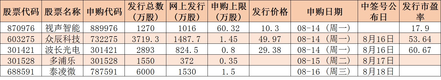 根據發行安排,下周(8月14日-18日)有5只新股發行,包括滬市主板新股1只、科創板新股1只、創業板新股2只、北交所新股1只。