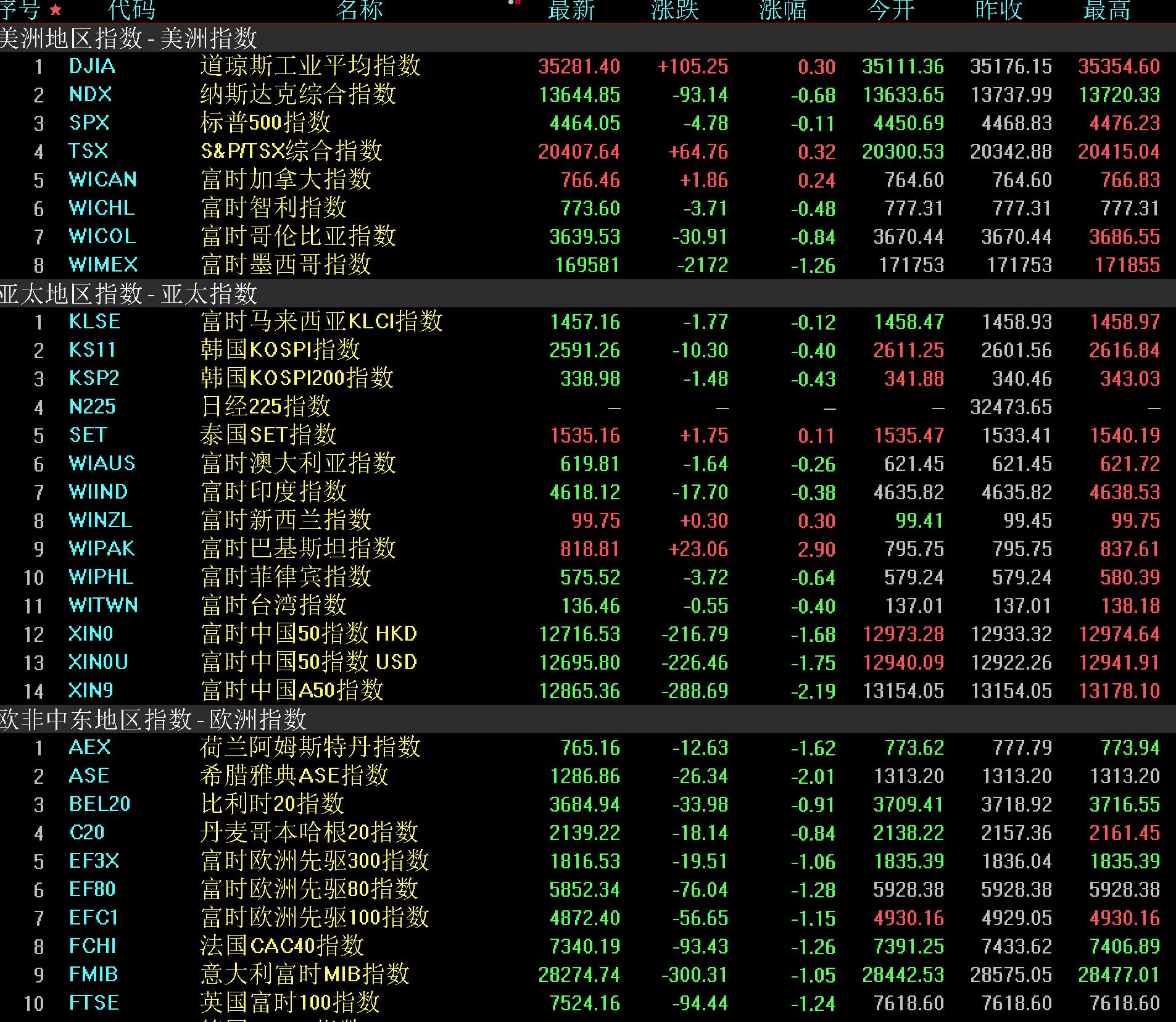 周五,美國三大股指收盤漲跌不一,道指漲0.3%報35281.4點,標普500指數跌0.11%報4464.05點,納指跌0.68%報13644.85點。本周,道指漲0.62%,標普500指數跌0.31%,納指跌1.9%。