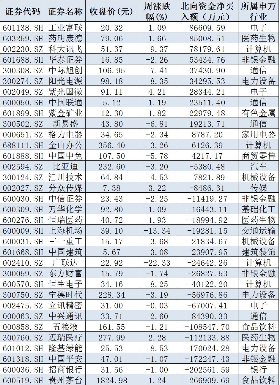 資金方面,本周北向資金累計凈賣出金額達224.20億元。從前十大成交活躍股來看,本周,工業富聯、藥明康德、科大訊飛等3只個股,北向資金凈買入金額均超7億元。另外,貴州茅臺、招商銀行、中國平安、隆基綠能等個股遭北向資金凈賣出金額均超17億元。