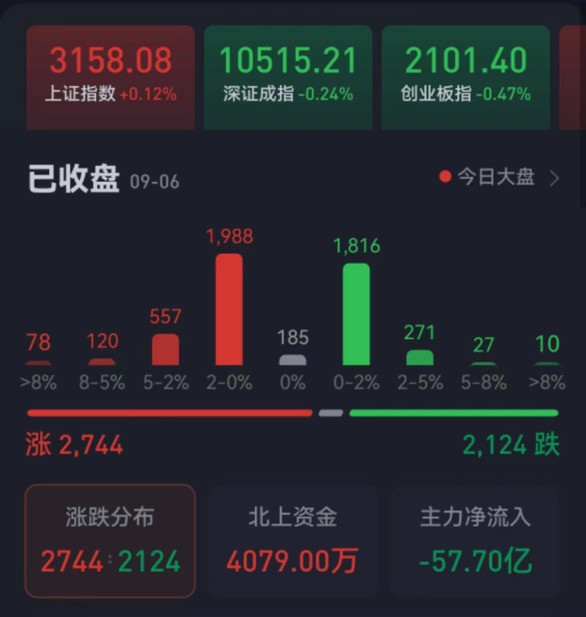 周三(9月6日),A股三大股指震蕩分化,漲跌不一。截至收盤,上證指數(shù)漲0.12%報(bào)3158.08點(diǎn),深證成指跌0.24%報(bào)10515.21點(diǎn),創(chuàng)業(yè)板指跌0.47%報(bào)2101.4點(diǎn);兩市合計(jì)成交金額達(dá)7712.08億元,北向資金凈買入4079萬元。總體上看,兩市個(gè)股漲多跌少。其中,漲停個(gè)股達(dá)38只,跌停個(gè)股達(dá)5只。