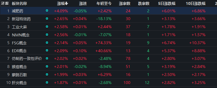 熱點方面,截至9月12日上午收盤,醫藥板塊再度活躍,減肥藥領漲,新冠特效藥、工業大麻、蒙脫石散、F5G概念等板塊漲幅居前。下跌方面,光刻膠、電子化學品、房地產服務、酒店及餐飲等板塊跌幅居前。