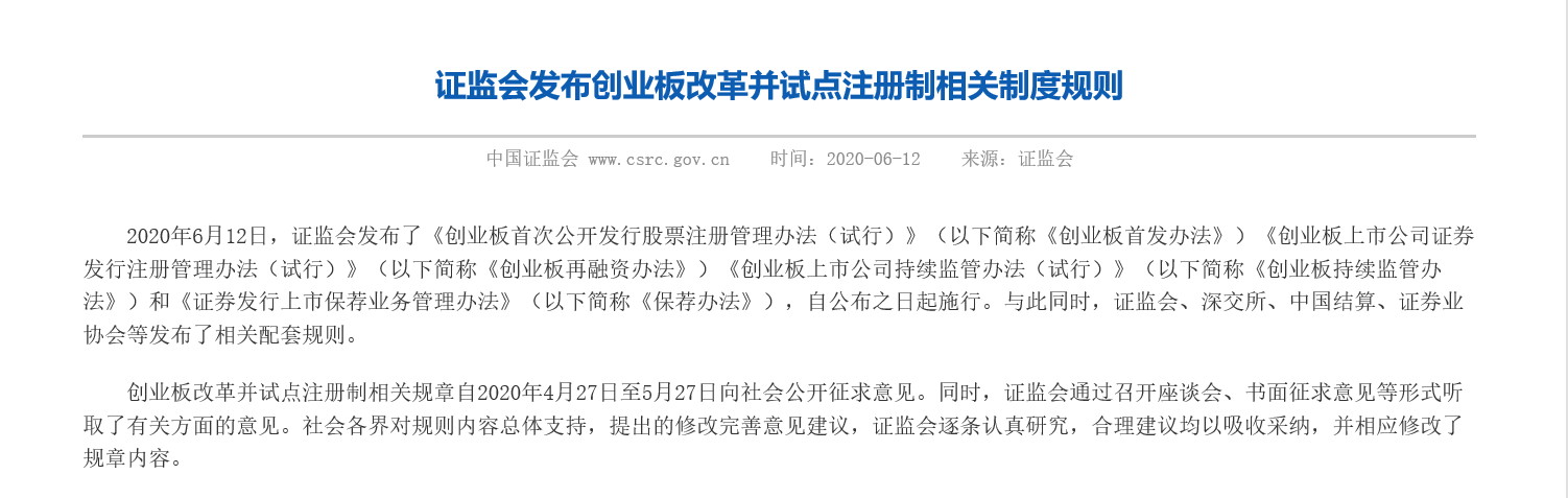 6月12日,證監會發布創業板改革并試點注冊制相關制度規則。