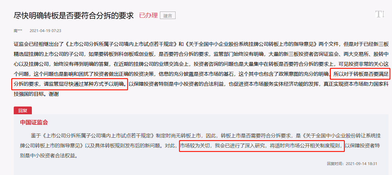 證監會已經相繼出臺了《上市公司分拆所屬子公司境內上市試點若干規定》和《關于全國中小企業股份系統掛牌公司轉板上市的指導意見》兩個文件,但是對于已經新三板精選層掛牌的上市公司的子公司,如果要轉板到科創板或創業板,是否要符合分拆的要求,監管部門始終沒有明確,請監管層盡快通過某種方式予以明確。
