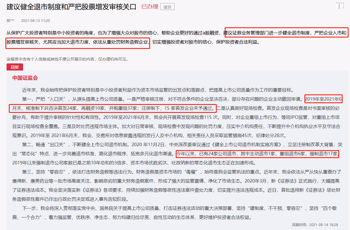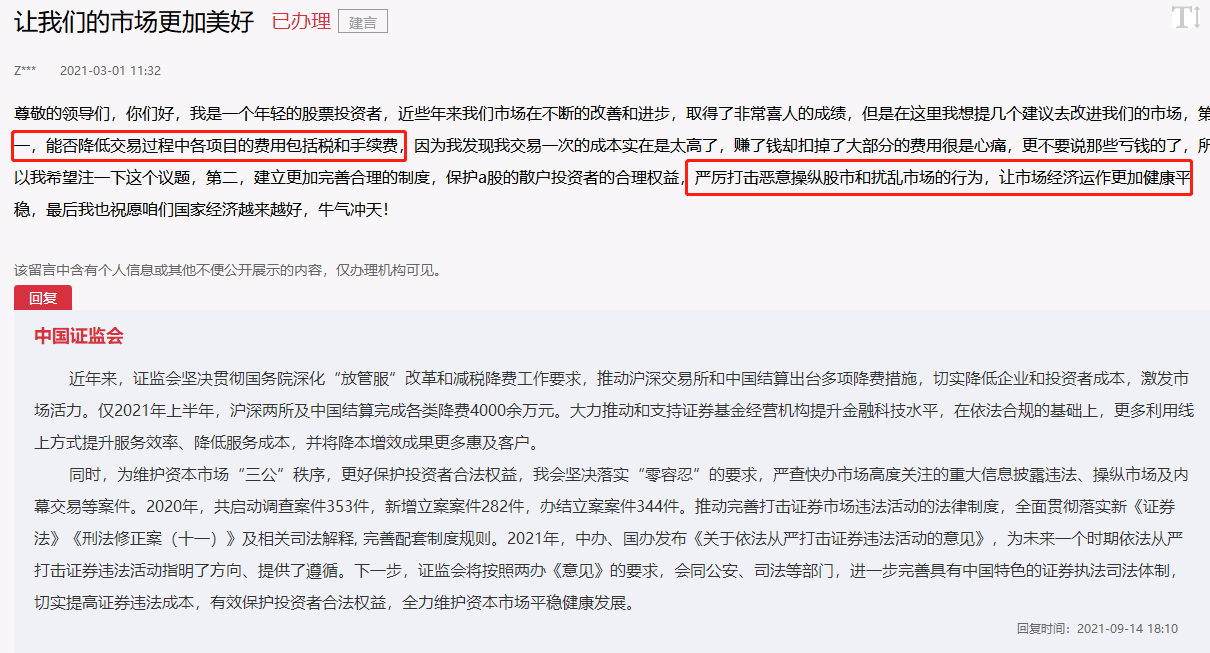 9月14日,在人民網的“領導留言板”上,證監會回復了網友關注的六個熱點問題,加強券商研報管理、明確精選層轉板上市是否要符合分拆要求、能否降低交易過程中各項目的費用包括稅和手續費、嚴厲打擊惡意操縱股市和擾亂市場的行為、健全退市制度、嚴把股票增發審核關口和成立類銀聯證券聯合系統等。
