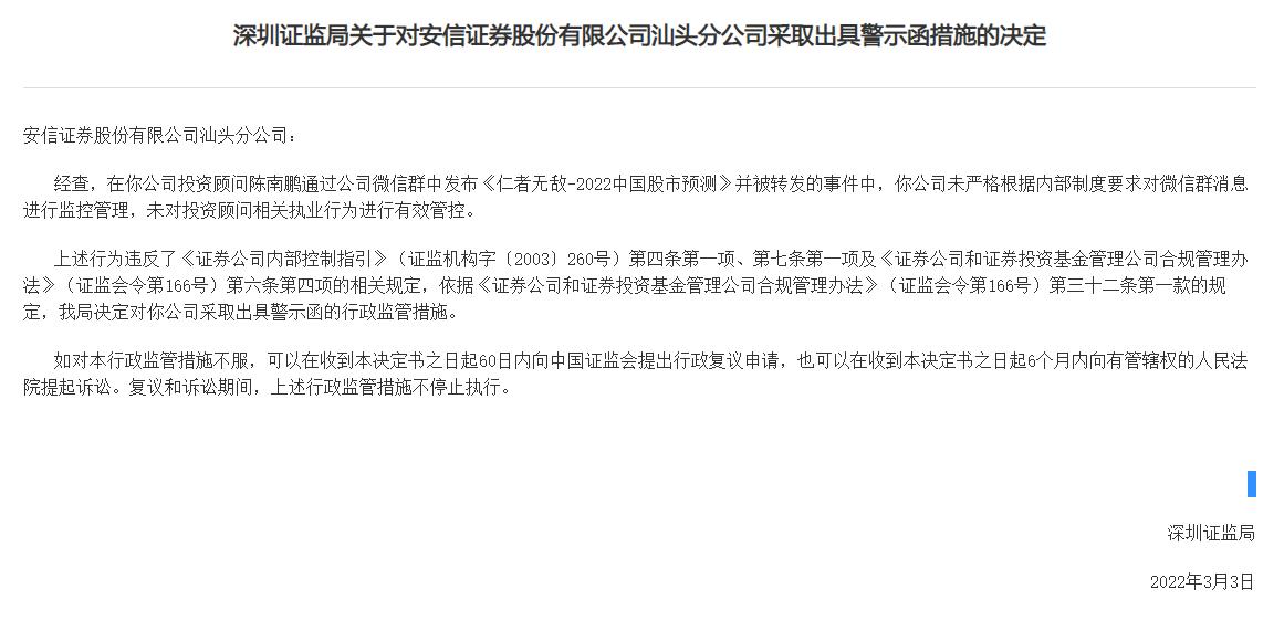 3月11日,深圳證監局披露對安信證券汕頭分公司和公司投資顧問陳南鵬的監管措施。原因是陳南鵬將股票根據五行屬性分類進行分析,制作并在公司微信群發布《仁者無敵-2022中國股市預測》的投資建議,該內容被轉發并對外傳播,相關預測對行業、市場的評論意見不審慎。深圳證監局認為該投資建議不具有合理依據,而公司未對群消息嚴格管控,故對公司和陳南鵬均采取行政監管措施。
