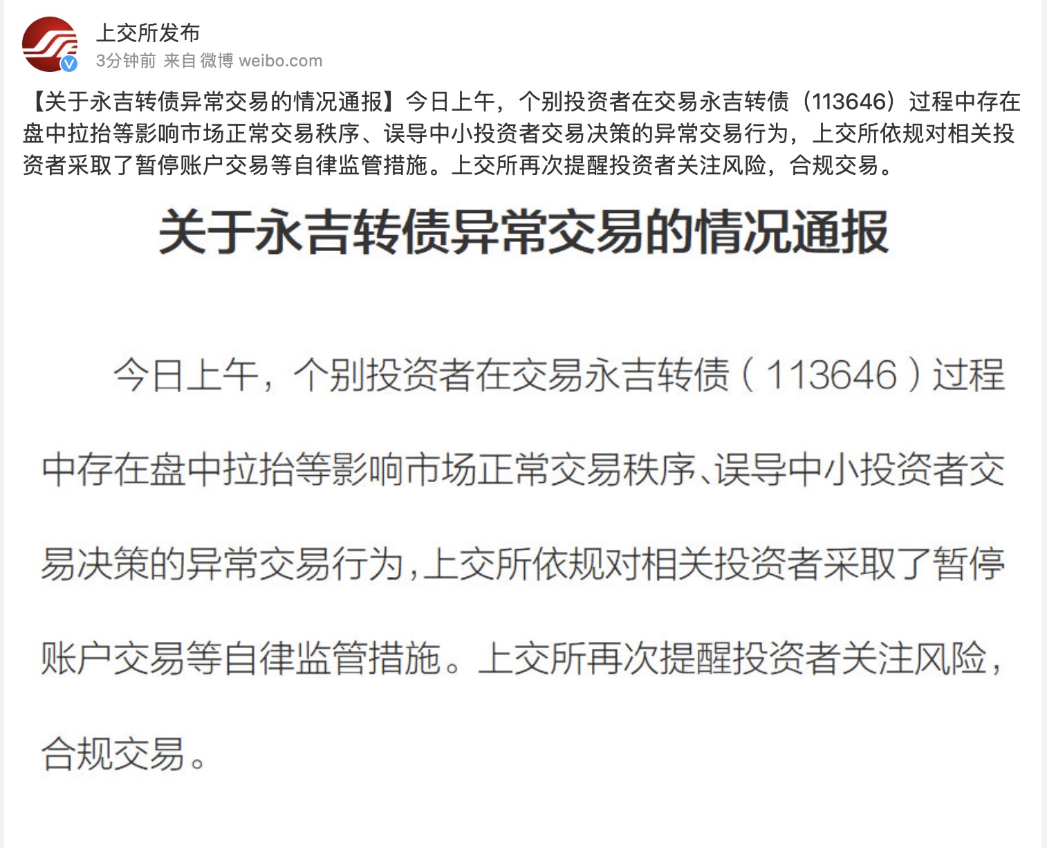 5月18日午間,上交所發布關于永吉轉債異常交易的情況通報。上交所表示,上午,個別投資者在交易永吉轉債(113646)過程中存在盤中拉抬等影響市場正常交易秩序、誤導中小投資者交易決策的異常交易行為,上交所依規對相關投資者采取了暫停賬戶交易等自律監管措施。上交所再次提醒投資者關注風險,合規交易。
