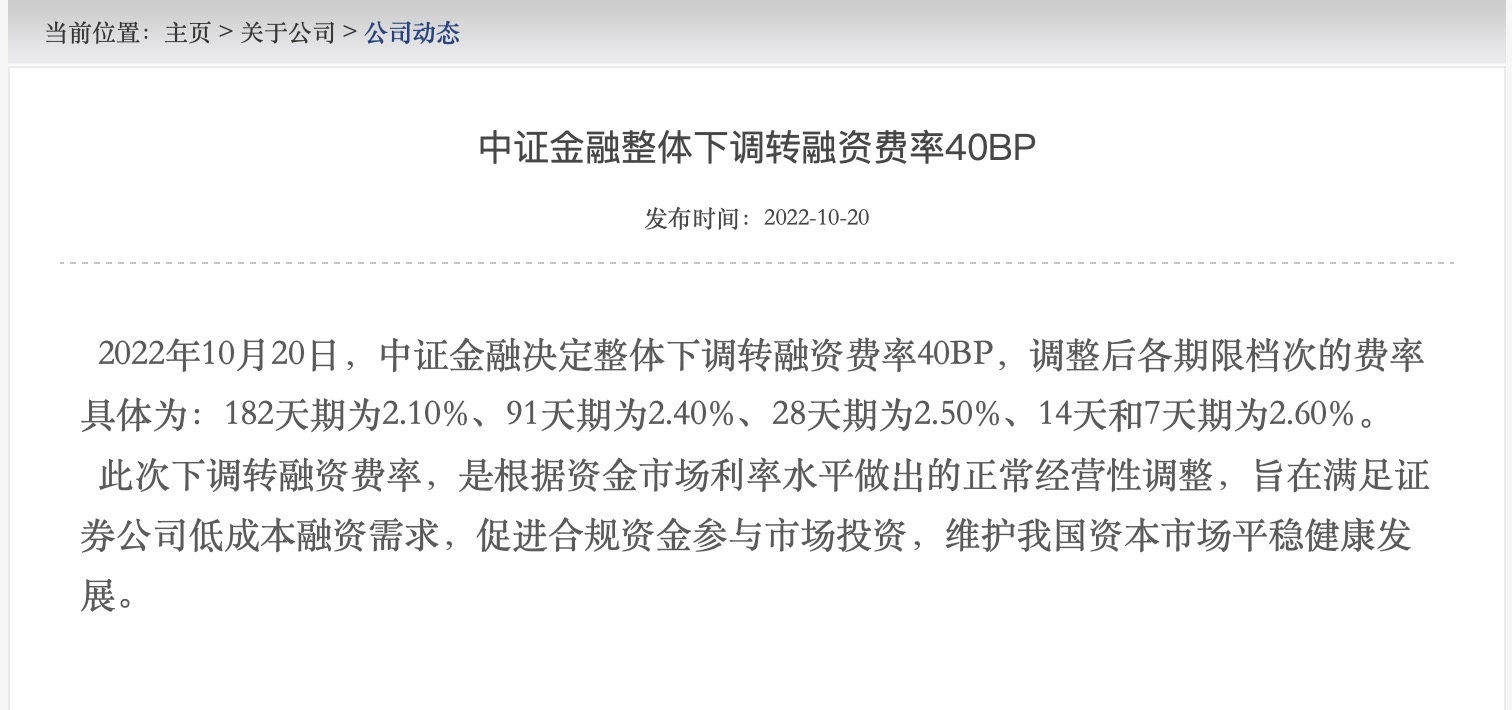 10月20日,中國證券金融股份有限公司(簡稱“中證金融”)決定整體下調轉融資費率40BP,調整后各期限檔次的費率具體為:182天期為2.10%、91天期為2.40%、28天期為2.50%、14天和7天期為2.60%。