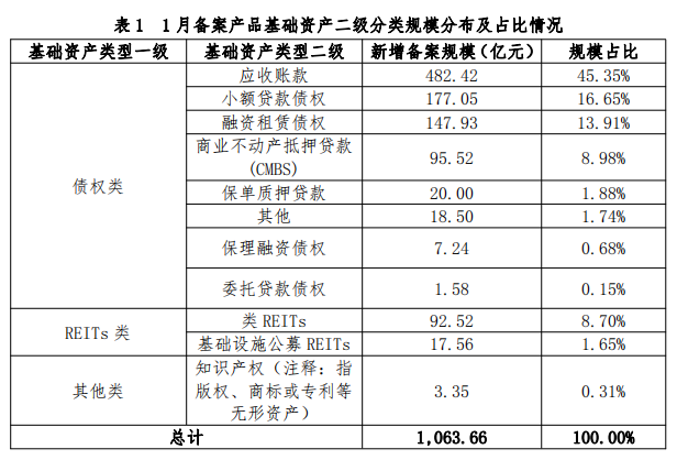 按基礎資產一級分類,1月份債權類產品新增備案規模950.24億元;REITs類產品新增備案規模110.08億元;其他類產品新增備案規模3.35億元。按基礎資產二級分類,小額貸款債權、應收賬款、融資租賃債權、商業不動產抵押貸款(CMBS)新增備案規模合計占月度備案產品新增備案規模的84.89%,較上月增長18.17%。