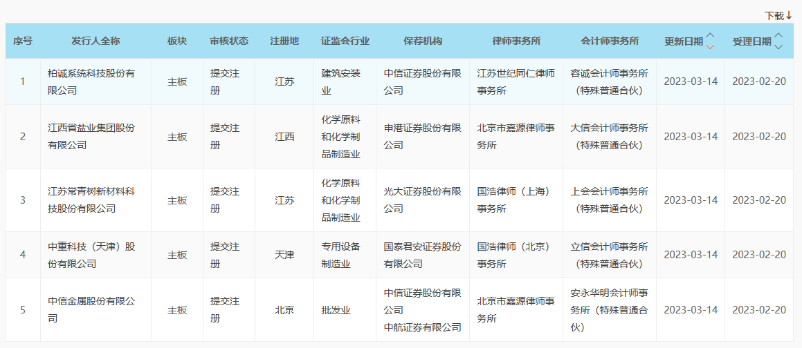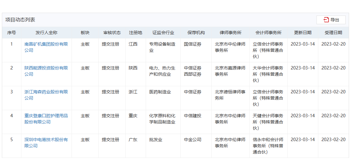 滬深交易所數據顯示,截至3月14日發稿,中信金屬、江鹽股份、常青科技、中重科技、柏誠股份、中電港、陜能股份、海森藥業、南礦集團、登康口腔等10家主板IPO企業提交注冊,這也是全面注冊制下首批提交注冊的主板IPO企業。