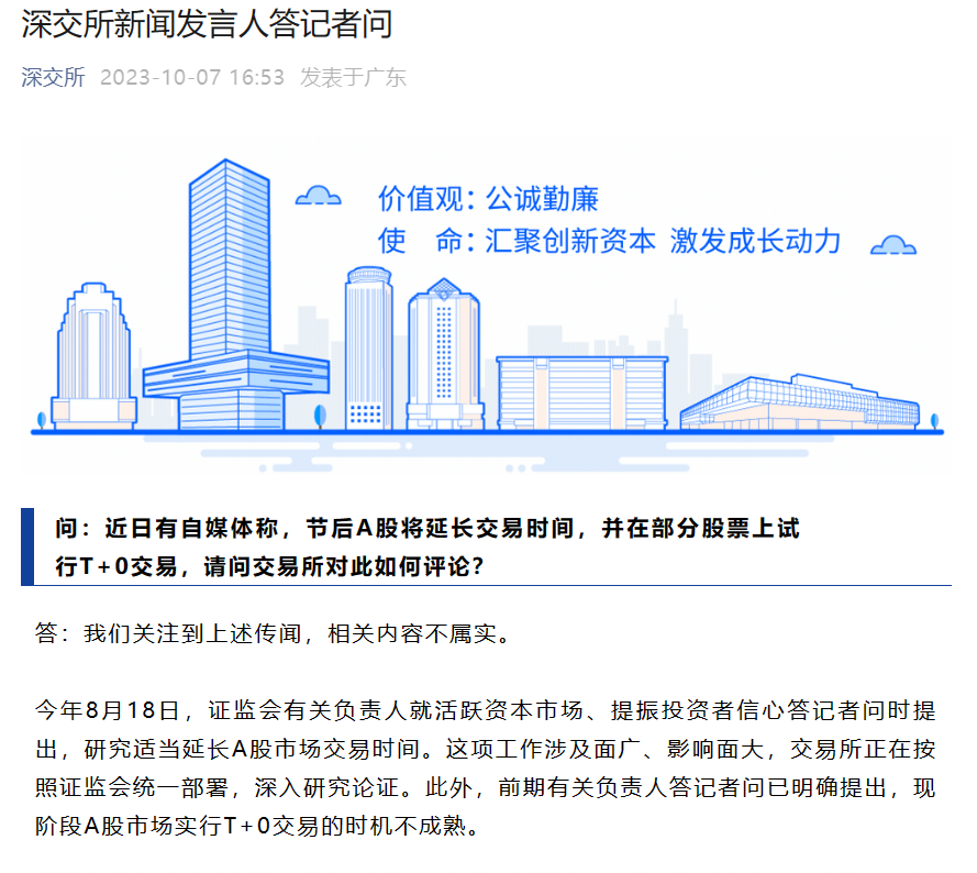 據(jù)滬深交易所微信公眾號(hào)消息,10月7日,滬深交易所相關(guān)負(fù)責(zé)人答記者問(wèn)時(shí)表示,“節(jié)后A股將延長(zhǎng)交易時(shí)間,并在部分股票上試行T+0交易”傳聞不屬實(shí)。