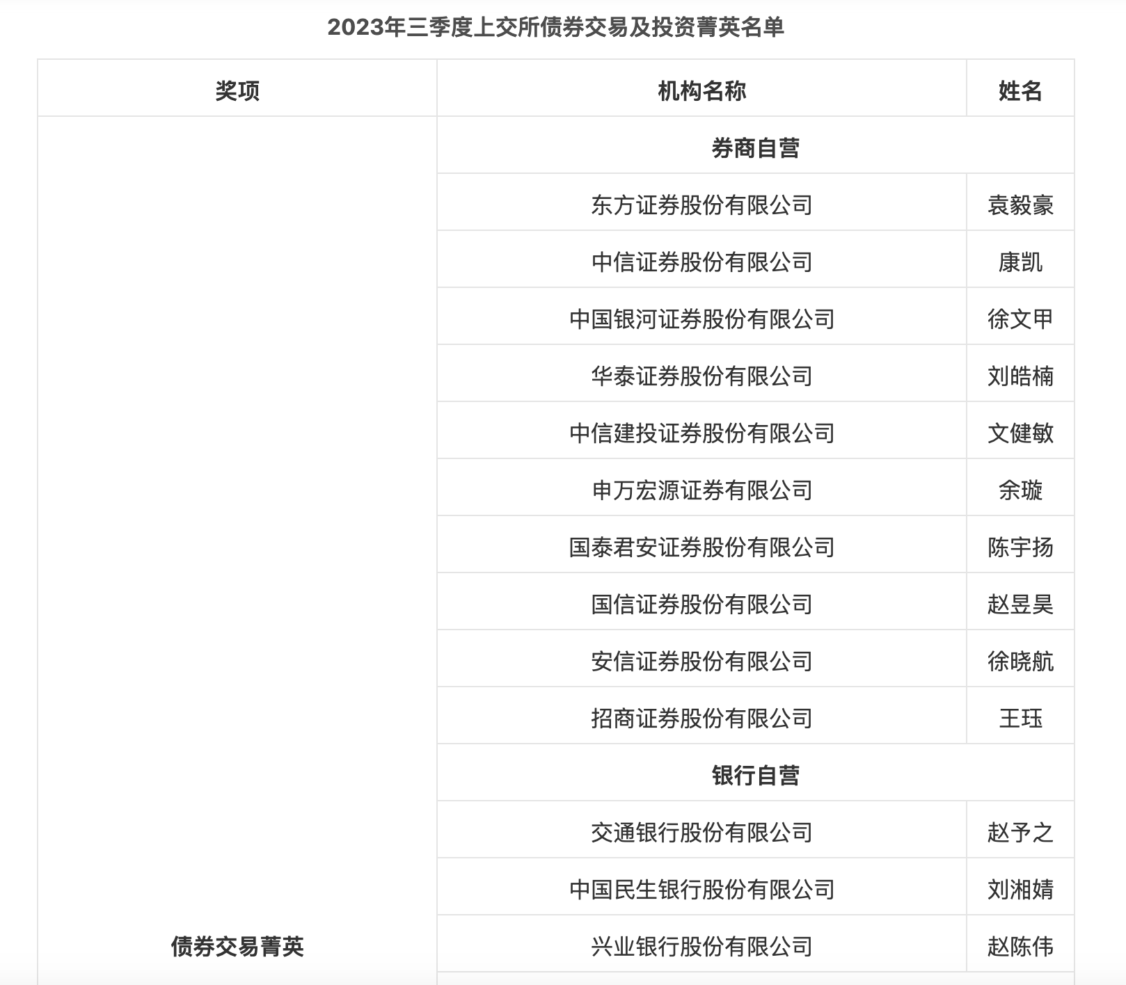 為鼓勵市場機構積極參與債券投資交易、做市業務及創新業務,推動交易所債券買方市場建設,2023年第三季度,上交所持續開展債券交易及投資菁英排名活動,共評選出16類獎項。