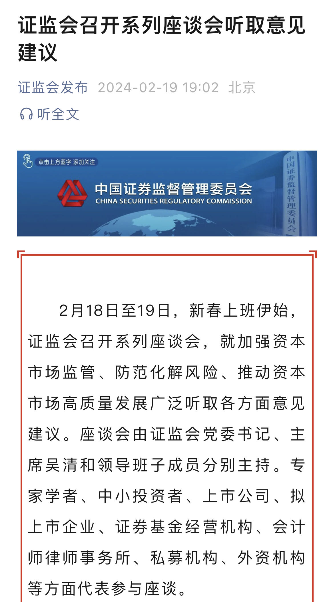 2月18日至19日,新春上班伊始,證監會召開系列座談會,就加強資本市場監管、防范化解風險、推動資本市場高質量發展廣泛聽取各方面意見建議。座談會由證監會黨委書記、主席吳清和領導班子成員分別主持。專家學者、中小投資者、上市公司、擬上市企業、證券基金經營機構、會計師律師事務所、私募機構、外資機構等方面代表參與座談。