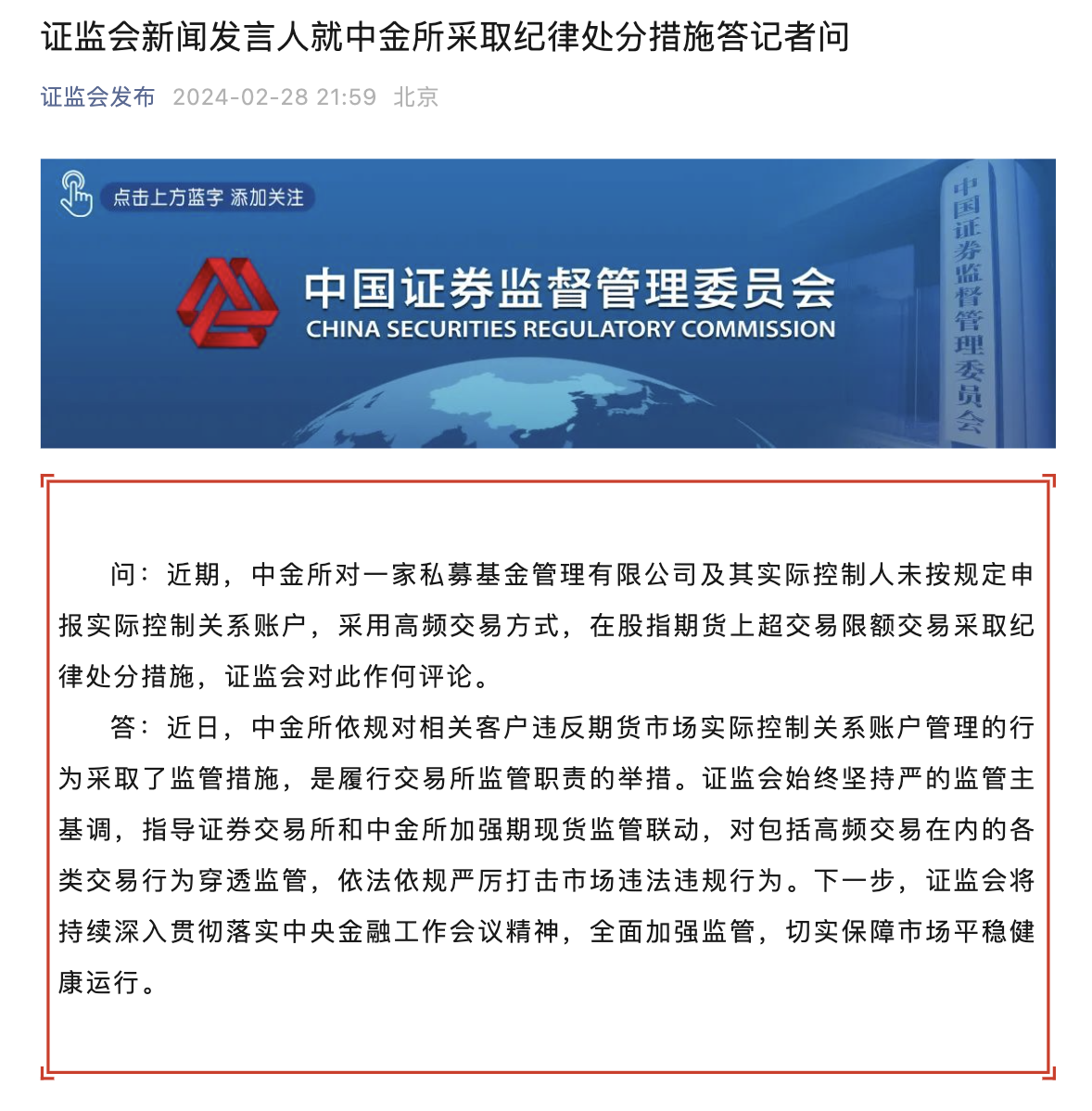 證監(jiān)會新聞發(fā)言人在答記者問時表示,近日,中金所依規(guī)對相關客戶違反期貨市場實際控制關系賬戶管理的行為采取了監(jiān)管措施,是履行交易所監(jiān)管職責的舉措。證監(jiān)會始終堅持嚴的監(jiān)管主基調,指導證券交易所和中金所加強期現(xiàn)貨監(jiān)管聯(lián)動,對包括高頻交易在內(nèi)的各類交易行為穿透監(jiān)管,依法依規(guī)嚴厲打擊市場違法違規(guī)行為。