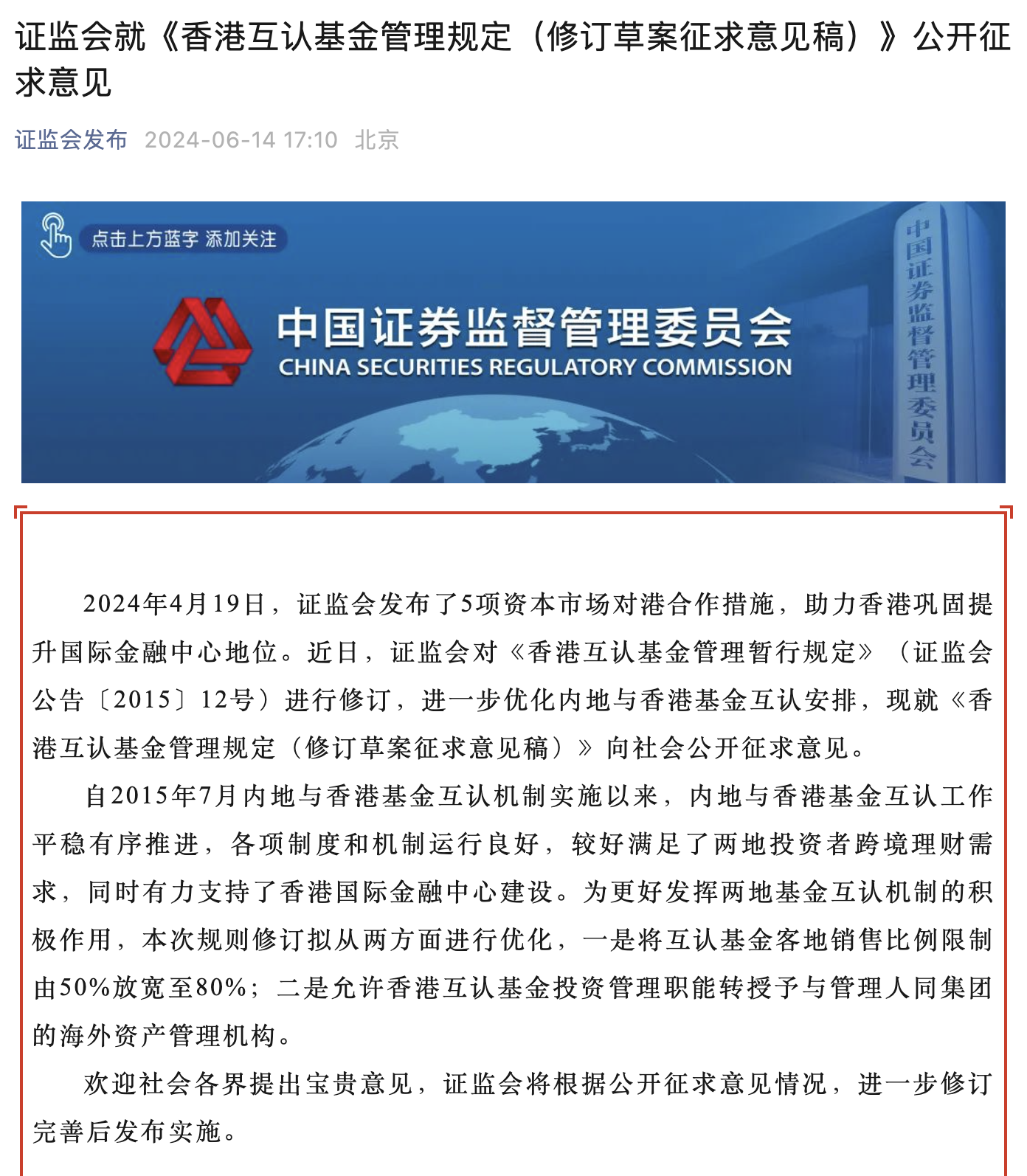 6月14日,中國證監會就《香港互認基金管理規定(修訂草案征求意見稿)》公開征求意見。