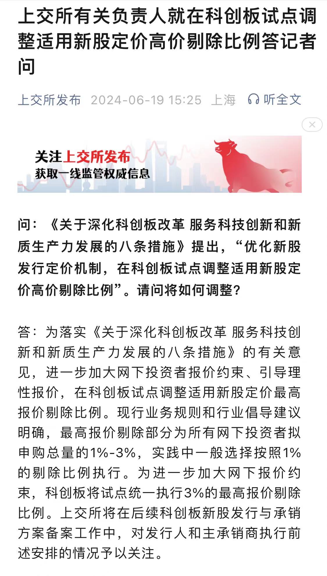 對此,上海證券交易所(下稱“上交所”)火速回應,為進一步加大網下報價約束,科創板將試點統一執行3%的最高報價剔除比例。同時,將在后續科創板新股發行與承銷方案備案工作中,對發行人和主承銷商執行前述安排的情況予以關注。