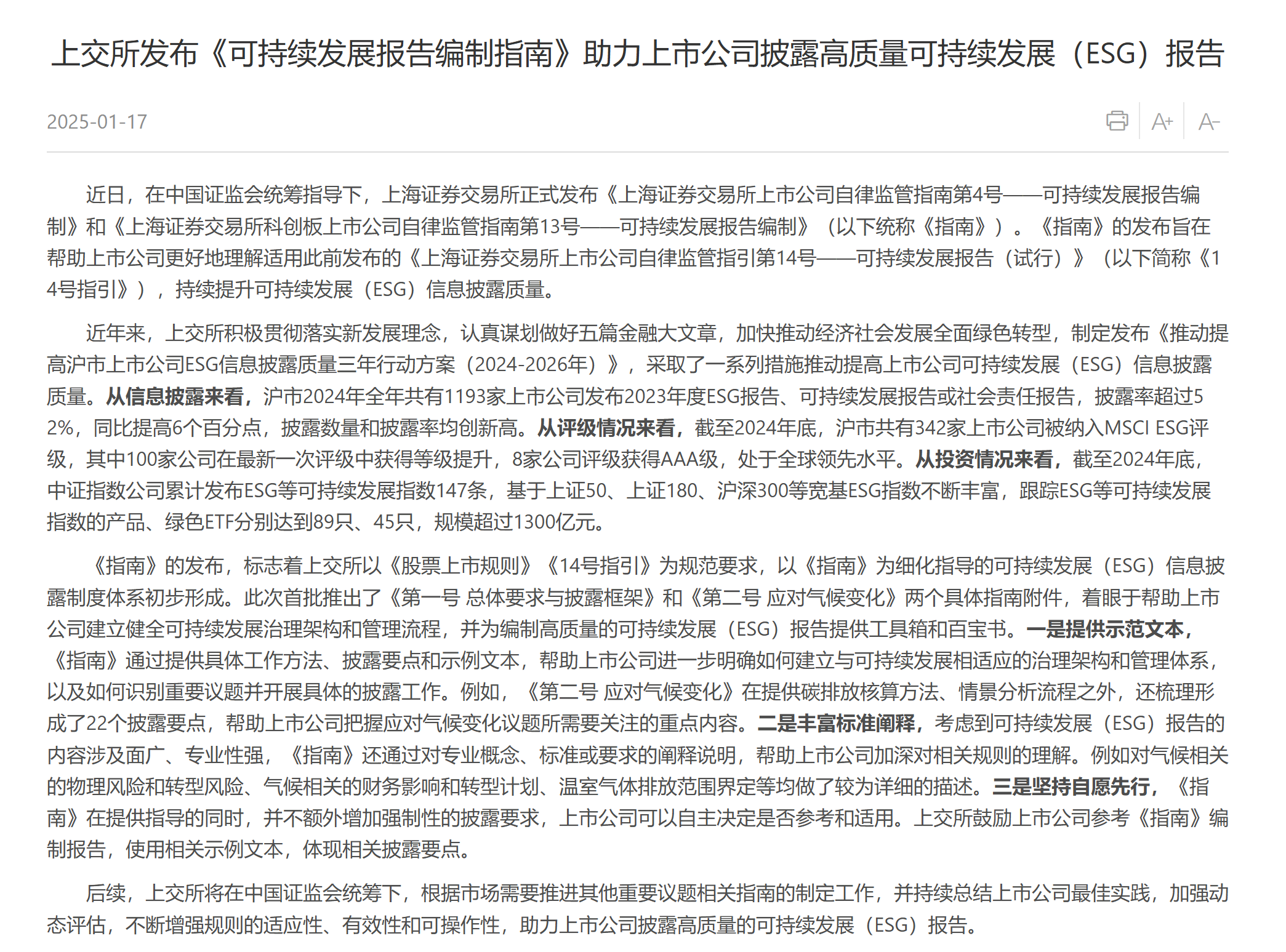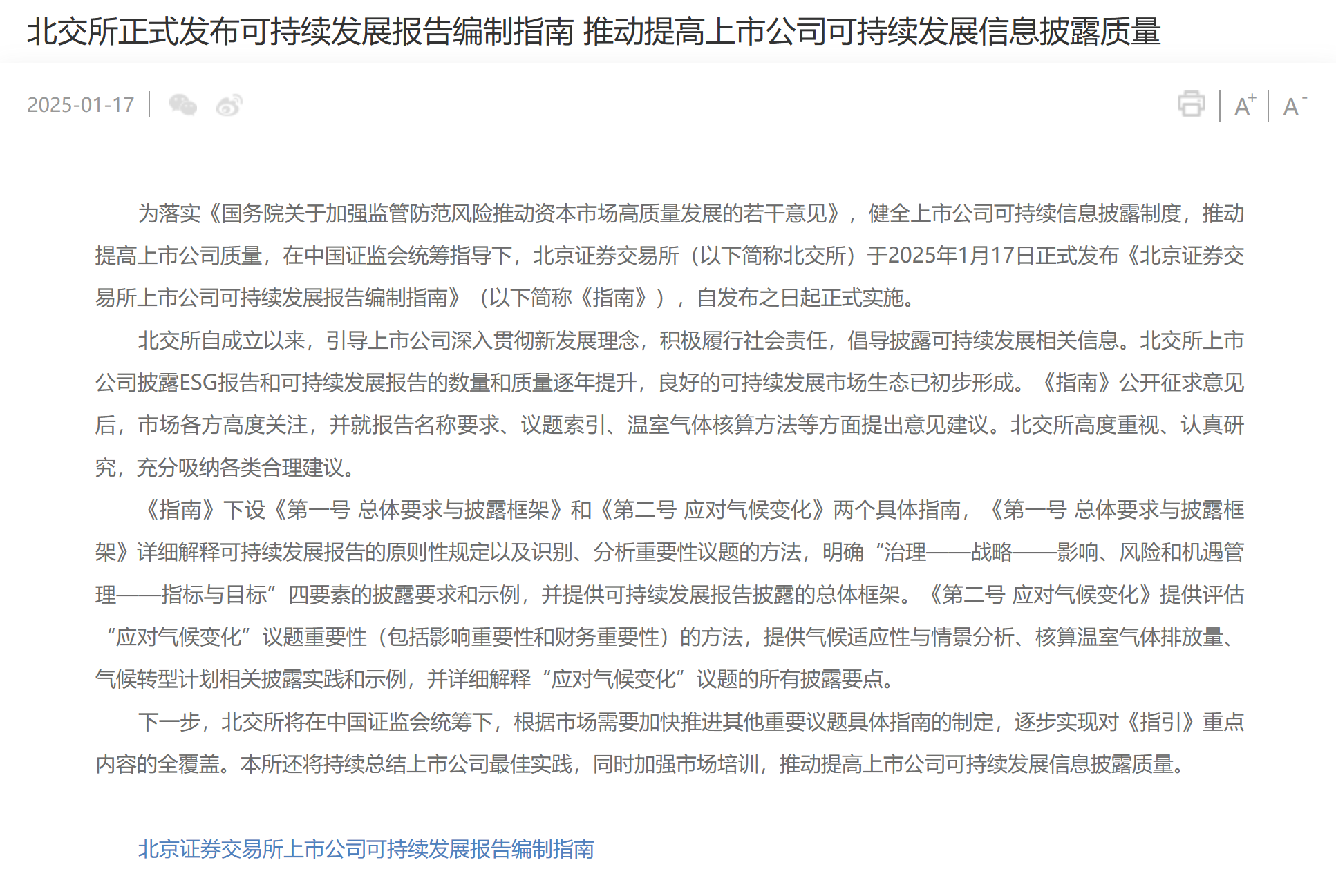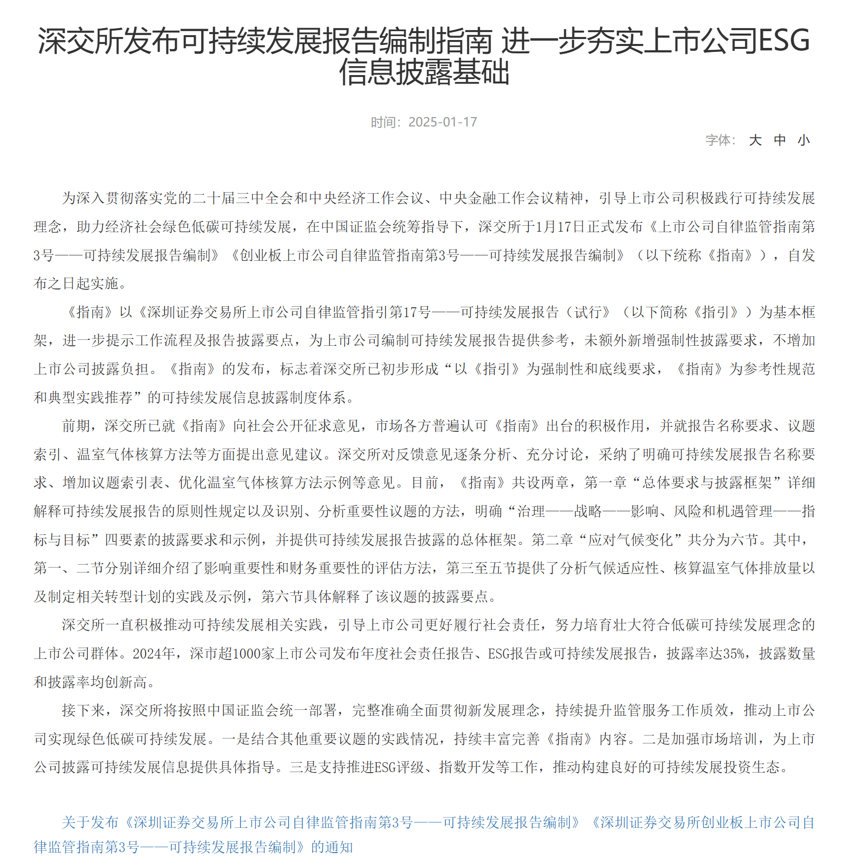 1月17日消息,為深入貫徹落實黨的二十屆三中全會和中央經濟工作會議、中央金融工作會議精神,引導上市公司積極踐行可持續發展理念,助力經濟社會綠色低碳可持續發展,在中國證監會統籌指導下,滬深北交易所正式發布《上海證券交易所上市公司自律監管指南第4號——可持續發展報告編制》《上海證券交易所科創板上市公司自律監管指南第13號——可持續發展報告編制》;《深圳證券交易所上市公司自律監管指南第3號——可持續發展報告編制》《深圳證券交易所創業板上市公司自律監管指南第3號——可持續發展報告編制》;《北京證券交易所上市公司可持續發展報告編制指南》(以下統稱《指南》),自發布之日起實施。