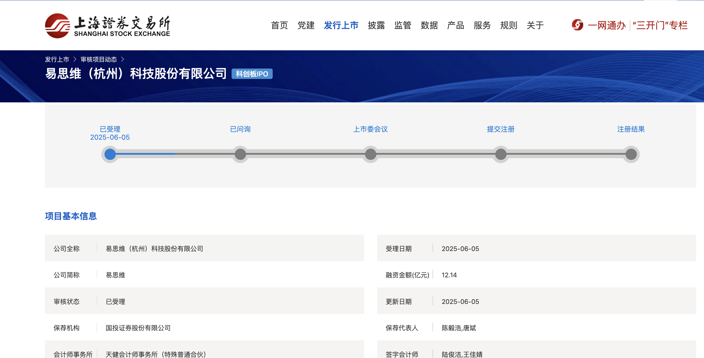 本報訊 (記者毛藝融)6月5日,上交所官網顯示,易思維(杭州)科技股份有限公司(以下簡稱“易思維”)在科創板上市的首發申請獲上交所受理,保薦機構為國投證券。這是上交所6月份受理的首家科創板IPO企業,也是今年上交所受理的第4家科創板IPO企業。